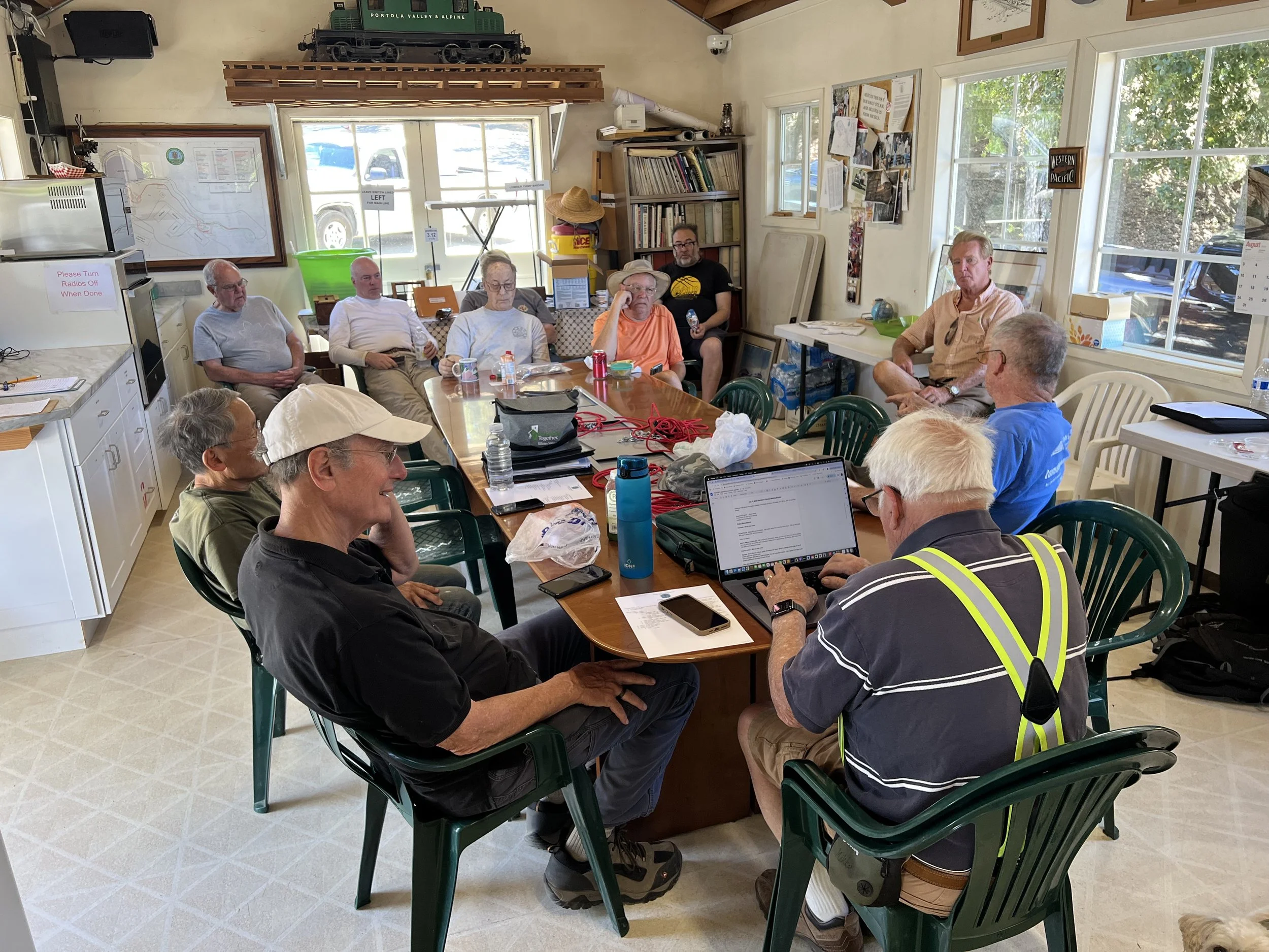 Bill reminded us that Yard Limit signs are speed limit and authority signs and designate where restrictions apply, but are not a geographic location  defining a  yard itself.  They are used anywhere, especially on main lines and assign authority to the trains in front of you thereby eliminating the first train’s flagging obligations. Engineers are obligated to maintain a slow speed so they can stop within ½ their sight distance. Nominally, 5 mph maximum.   There is one Yard Limit sign on the right side of the track (Engineers side) at every entry into a yard limit area. When you depart a yard limit area, you will see the back of a Yard Limit sign on your left (Fireman’s side) and may resume normal speed limits. Note that the main track around Rabbit Flat will stay at Yard Limit speeds, so that trains exiting Rabbit Flat spurs or the turntable will not have to contend with fast mainline traffic. Smokey Bear Point is also a speed restriction zone due to visibility and will apply in both directions, primarily because of the back-in yard when reverse running. And if you do see someone speeding through a yard, please remind them of the Yard Limit rules.