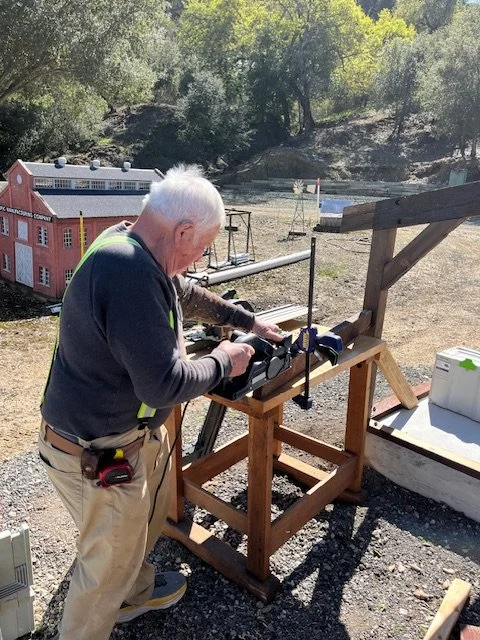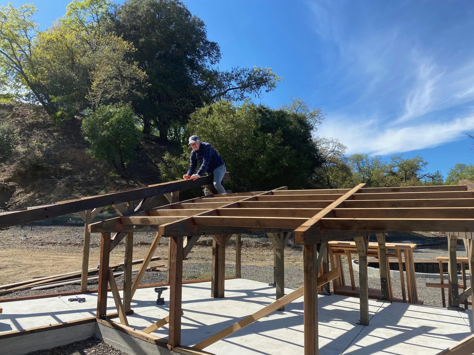 It was another beautiful day in the at the Railroad. Will climbed on top of the round house to fine-tune the rafters mounts for a flat roof.