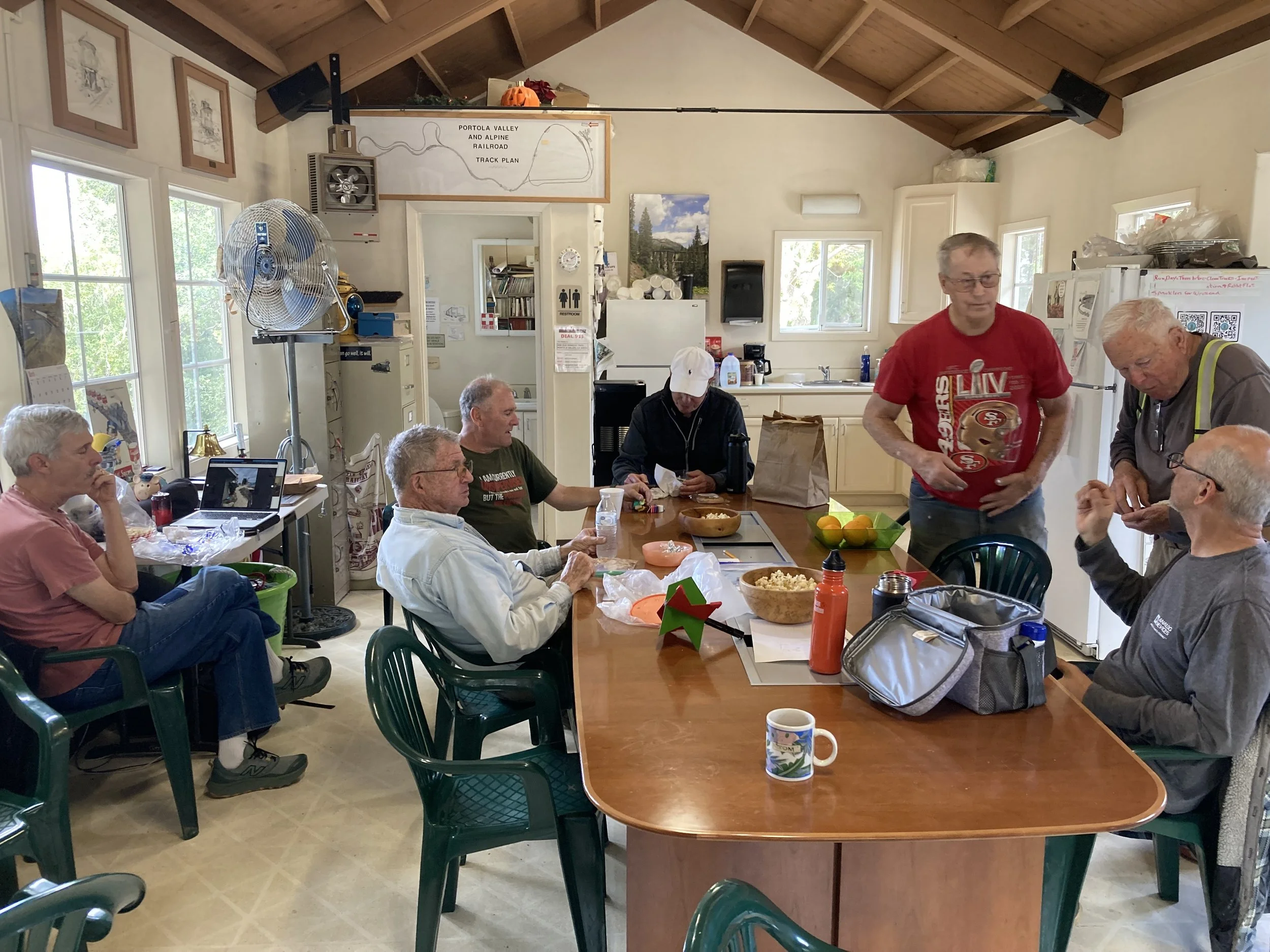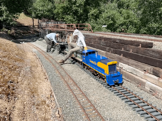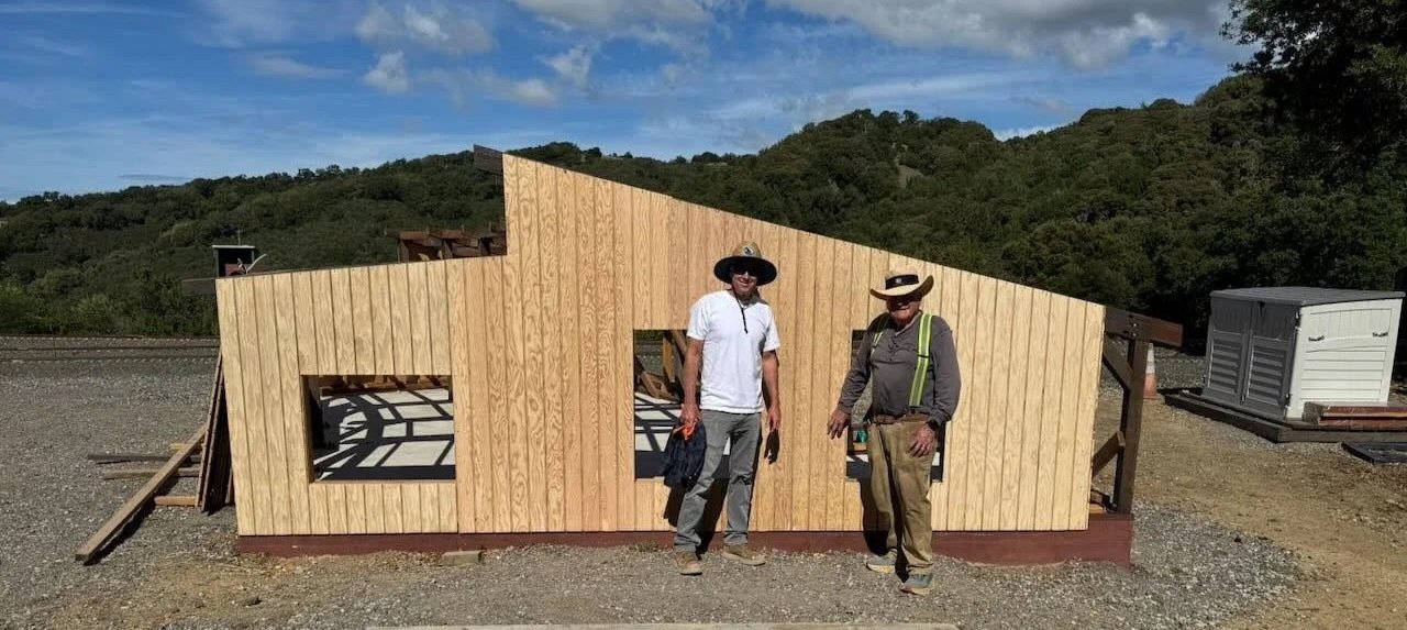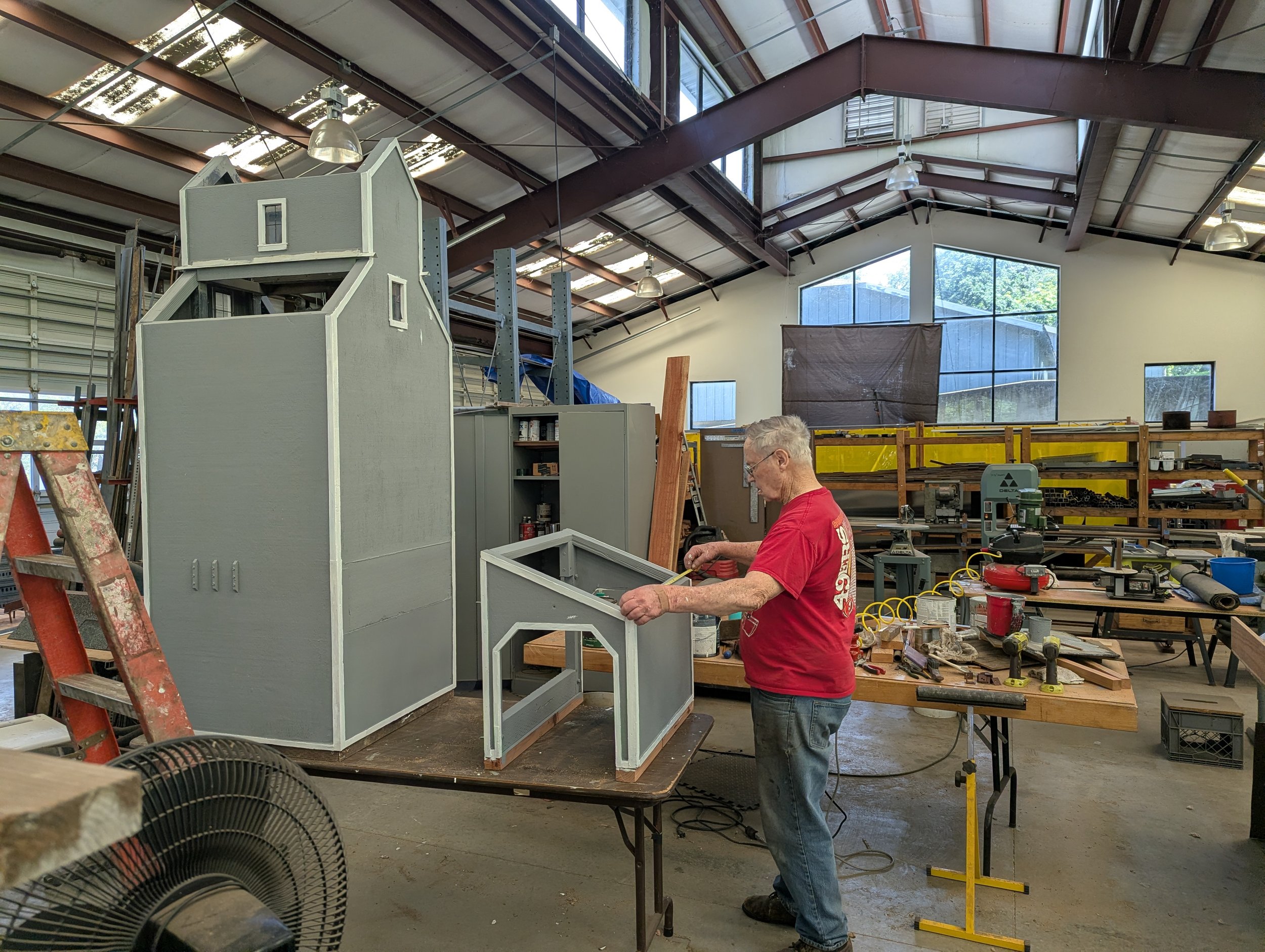 The team installed the first exterior wall. Note the cutouts for the window assemblies that have already been built and are waiting in Bldg 4 for installation. You can see the grooves on the siding. These grooves simulate shiplapped boards. The spacing at full scale would be about 18 inches. Mike confirmed that 18-inch shiplapped siding was used in the late 1800s for this purpose. Mike’s attention to detail in the design and construction of the Roundhouse contributes to the aesthetic and will provide us with a significant addition to the railroad.