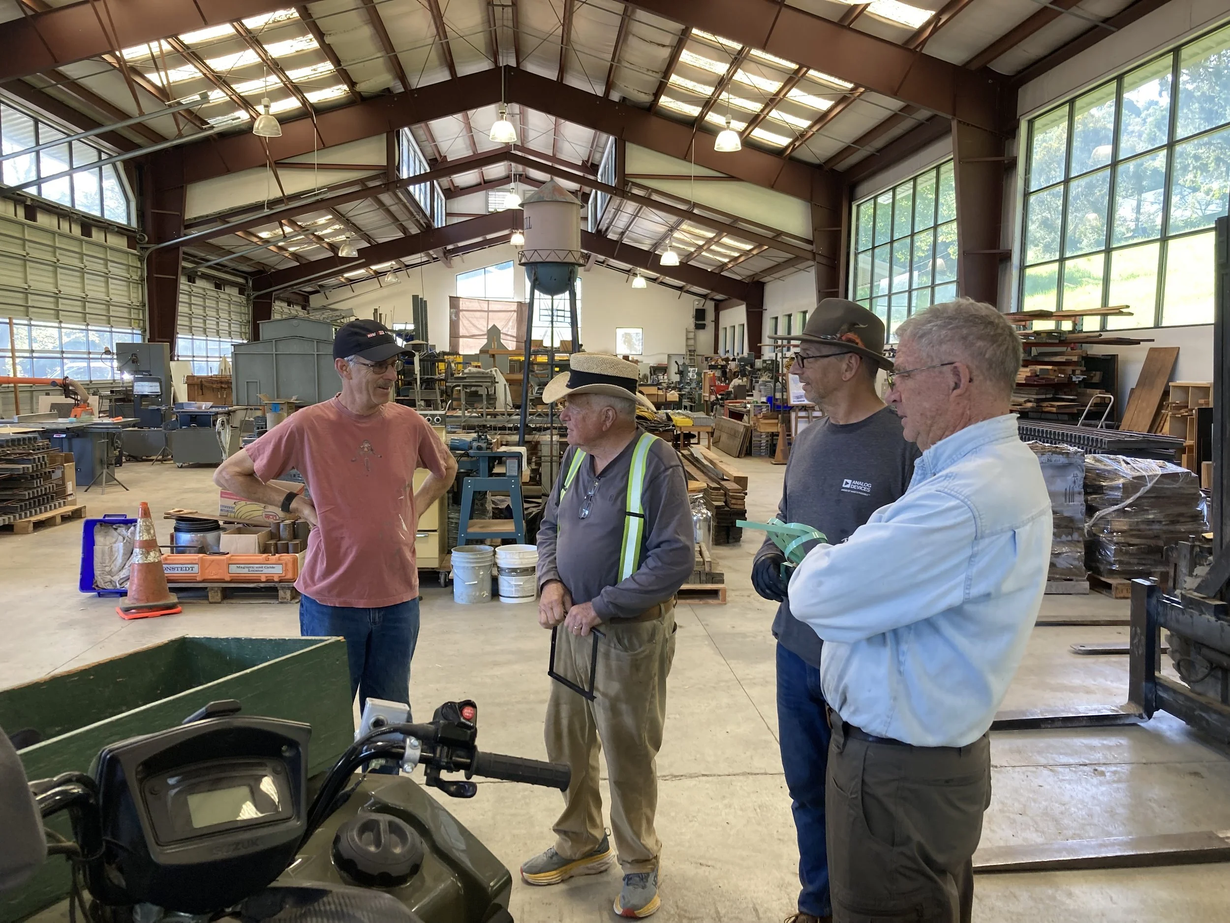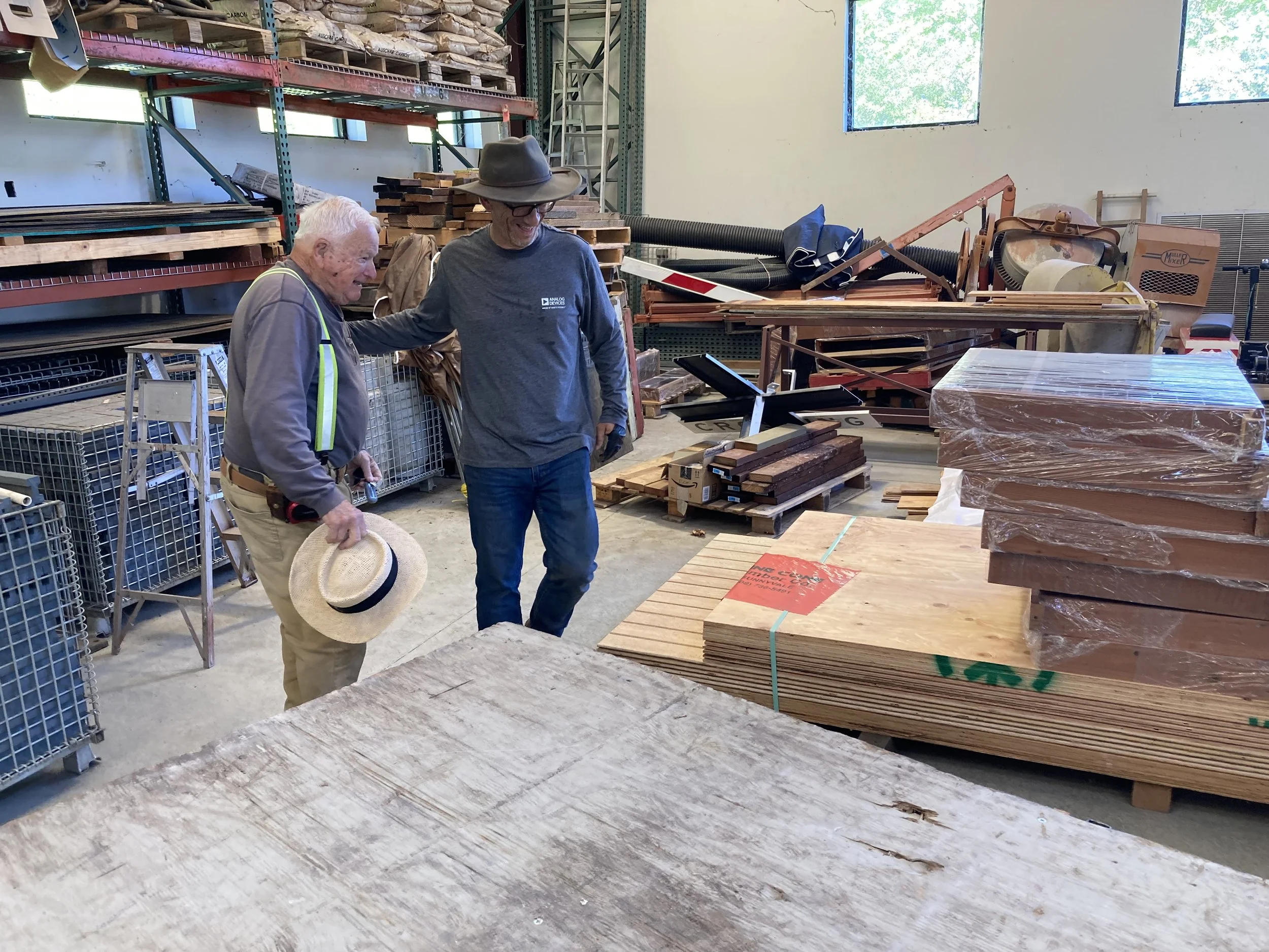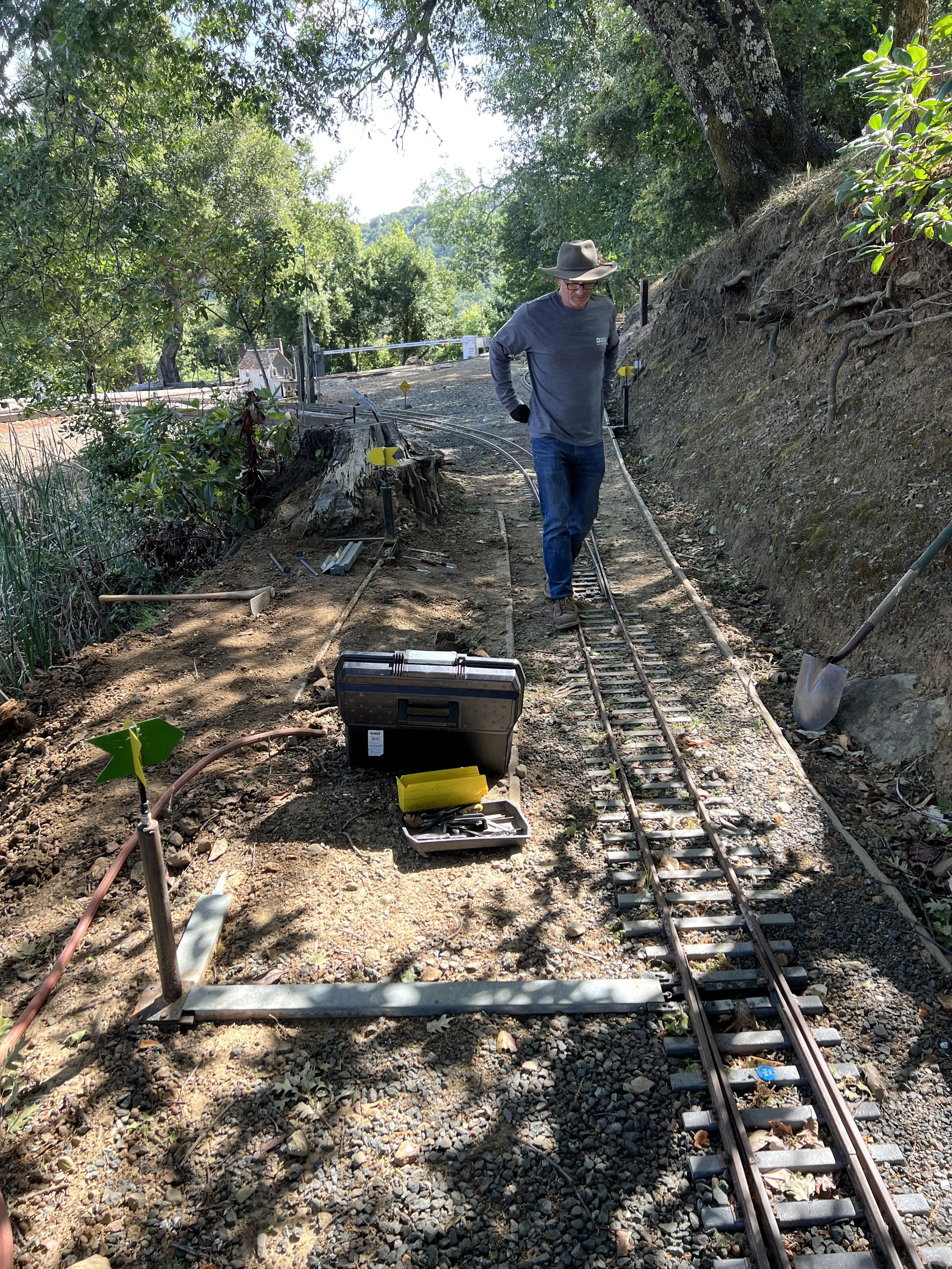 The team installed the first exterior wall. Note the cutouts for the window assemblies that have already been built and are waiting in Bldg 4 for installation. You can see the grooves on the siding. These grooves simulate shiplapped boards. The spacing at full scale would be about 18 inches. Mike confirmed that 18-inch shiplapped siding was used in the late 1800s for this purpose. Mike’s attention to detail in the design and construction of the Roundhouse contributes to the aesthetic and will provide us with a significant addition to the railroad.