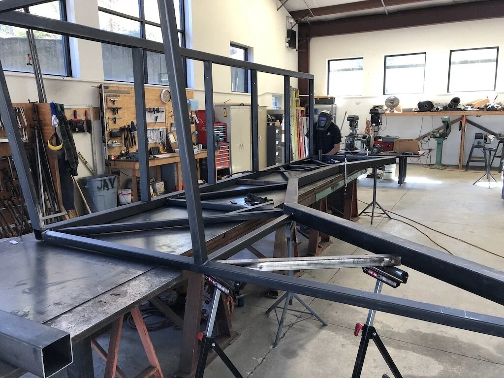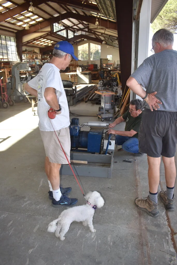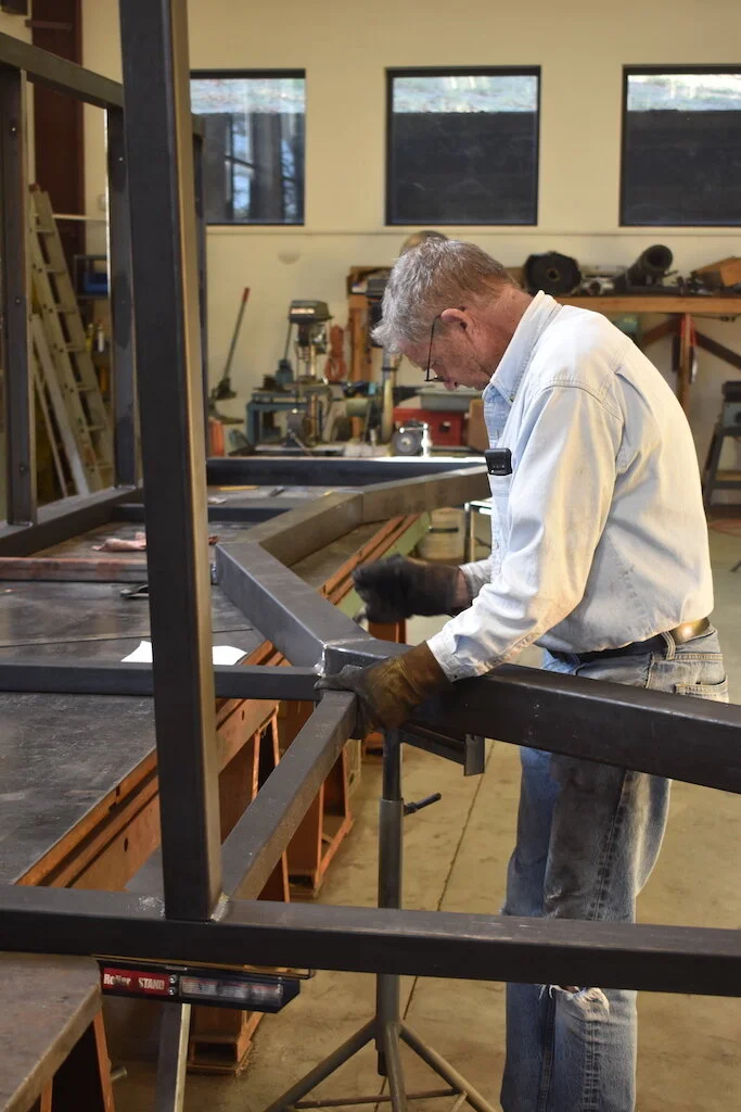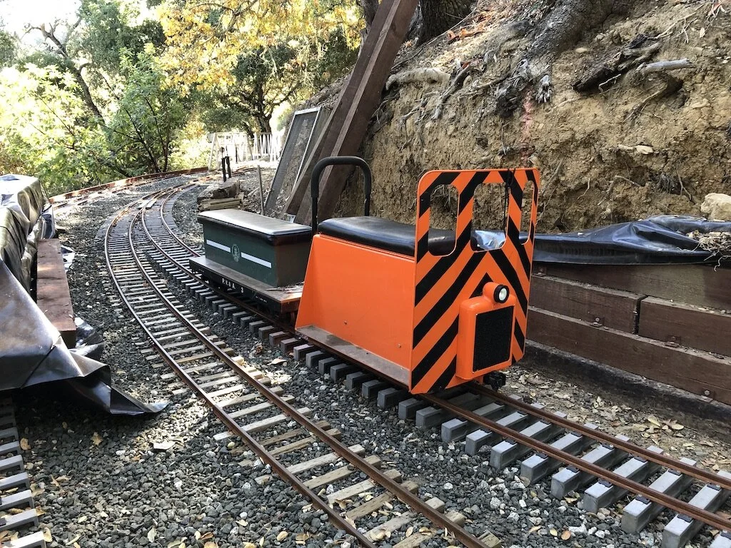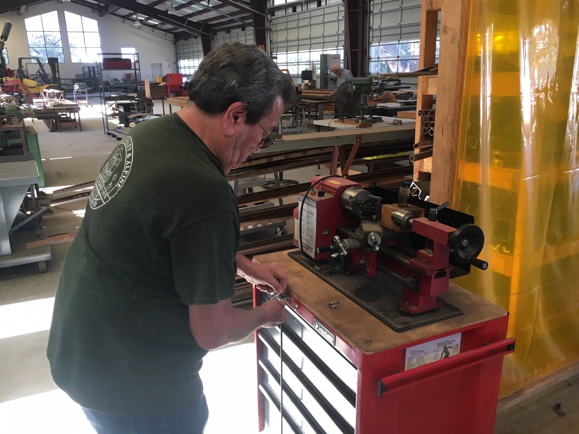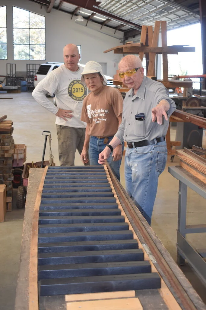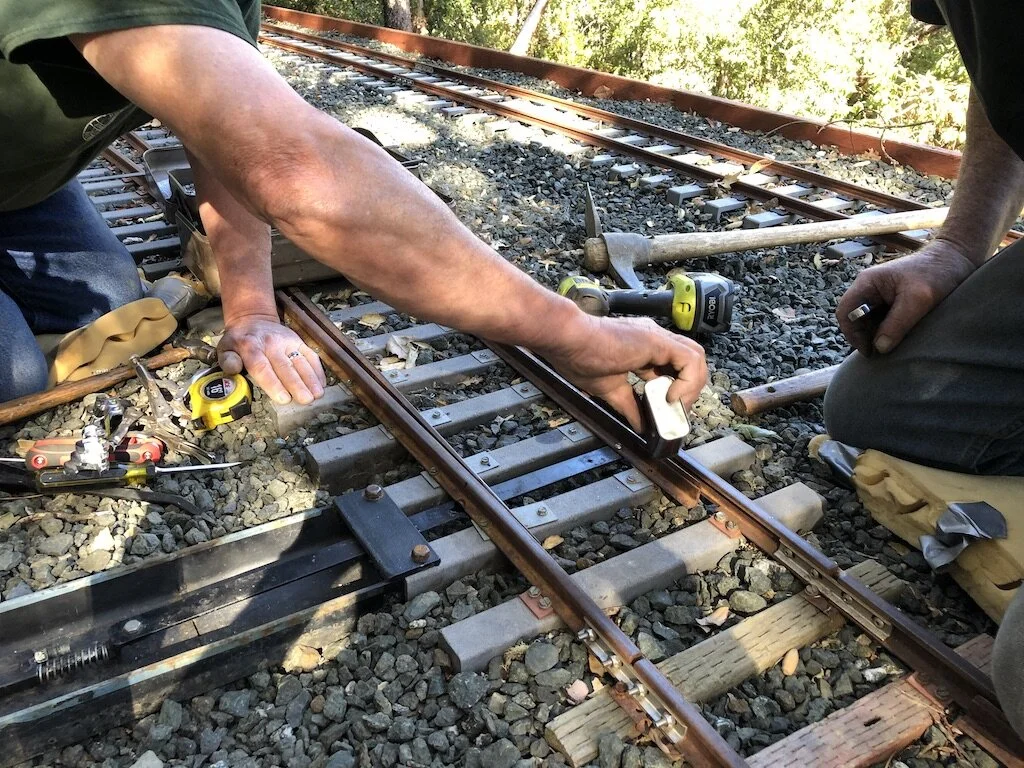 The most exciting success today was the opening of the first panels of the Lumber Camp Loop departure track. Tom & Carl worked their magic to get a switch stand installed. Not easy to do.