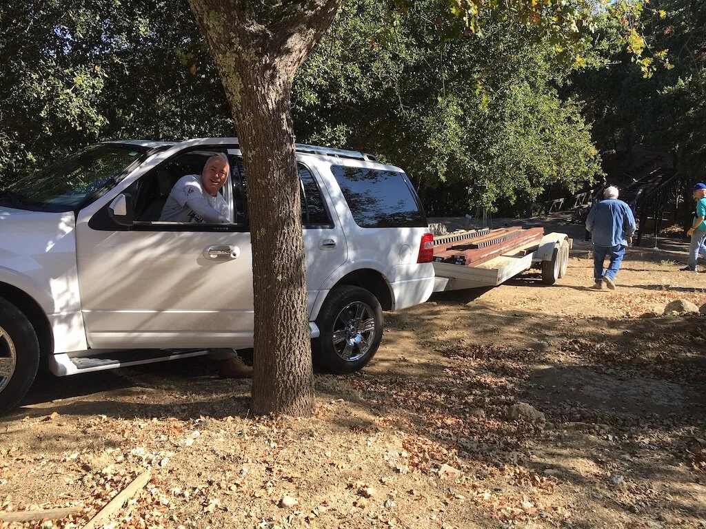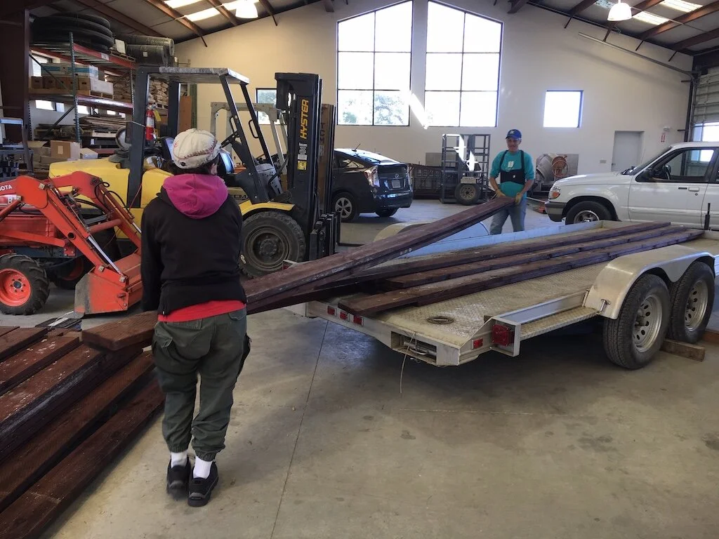 A new phase in the progress for the Lumber Camp Bridge was reached this week. The decking was laid on the installed sections. Bruce supplied the lifting power to move supplies needed for the Lumber Camp Bridge from the workshop. Randy, Mike, & Ken then started to attach the PT decking material.