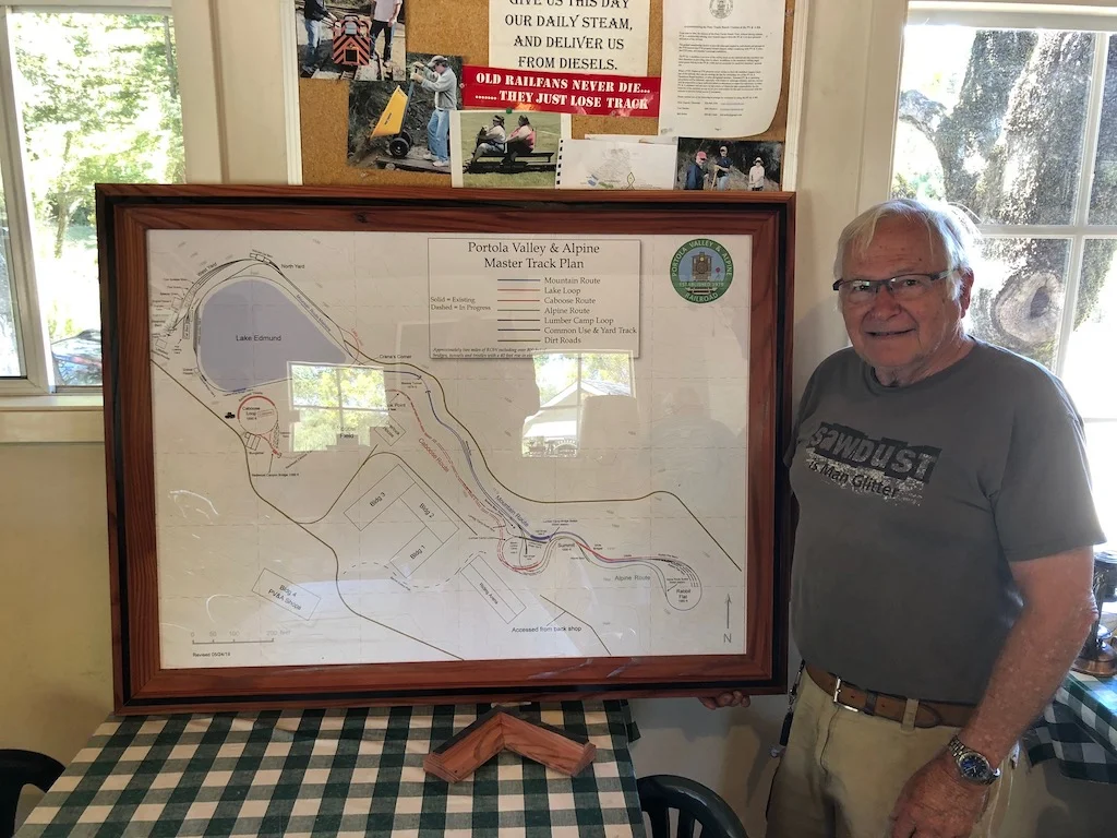 Mike displayed the first of three maps of the PV&A RR right-of-way. Framed in redwood felled and milled on the ranch, this is a long overdue update to our seven year old map. Contributors to the map project were Mike Masse, Peter Blum, Mike Ward, Randy Ahlkvist, Bill Boller, and Bob Silverstein. If you’d like your own unframed copy you can visit the track map webpage.