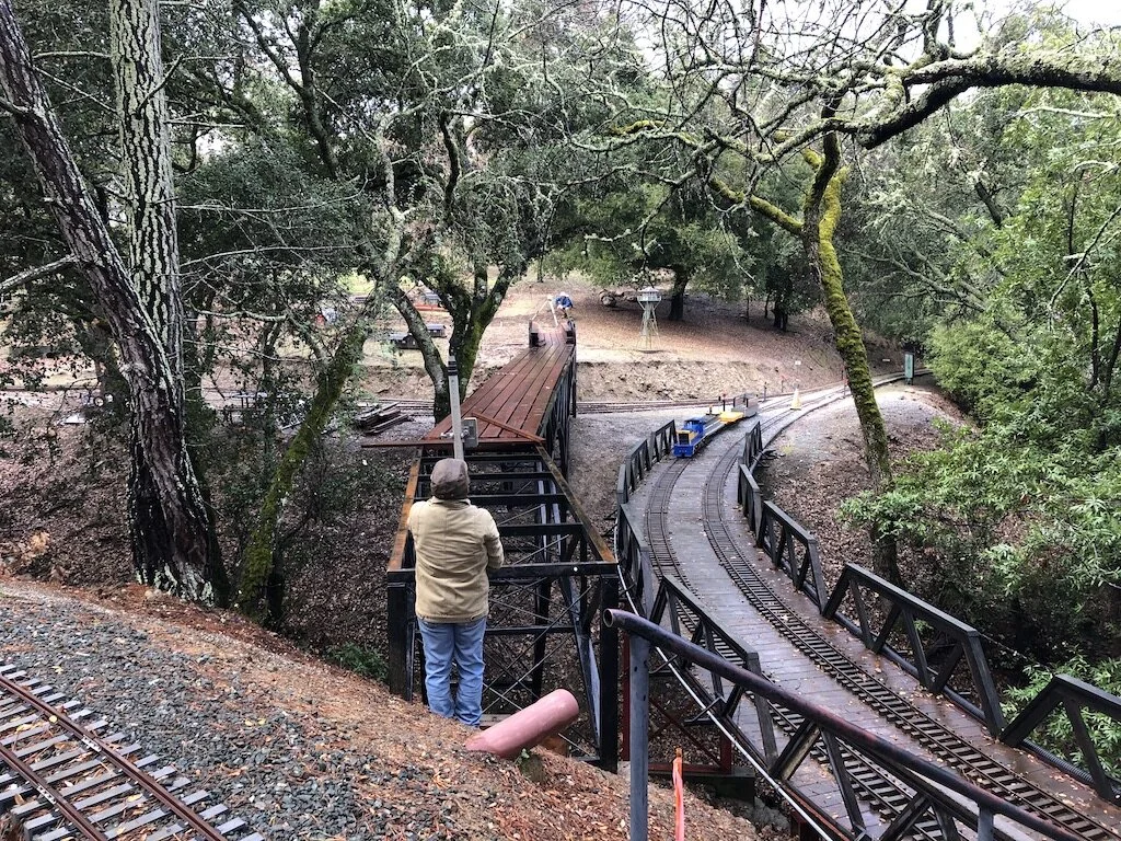 Kevin, Bill, and Bruce concluded that the planned track from the Bridge towards the Caboose “Lumber Camp North Spur” on our current map can’t be built because of the >4% grade for 200’+ of track. This decision to delete this spur will greatly simplify the task of building the trestle section of the Lumber Camp Bridge.