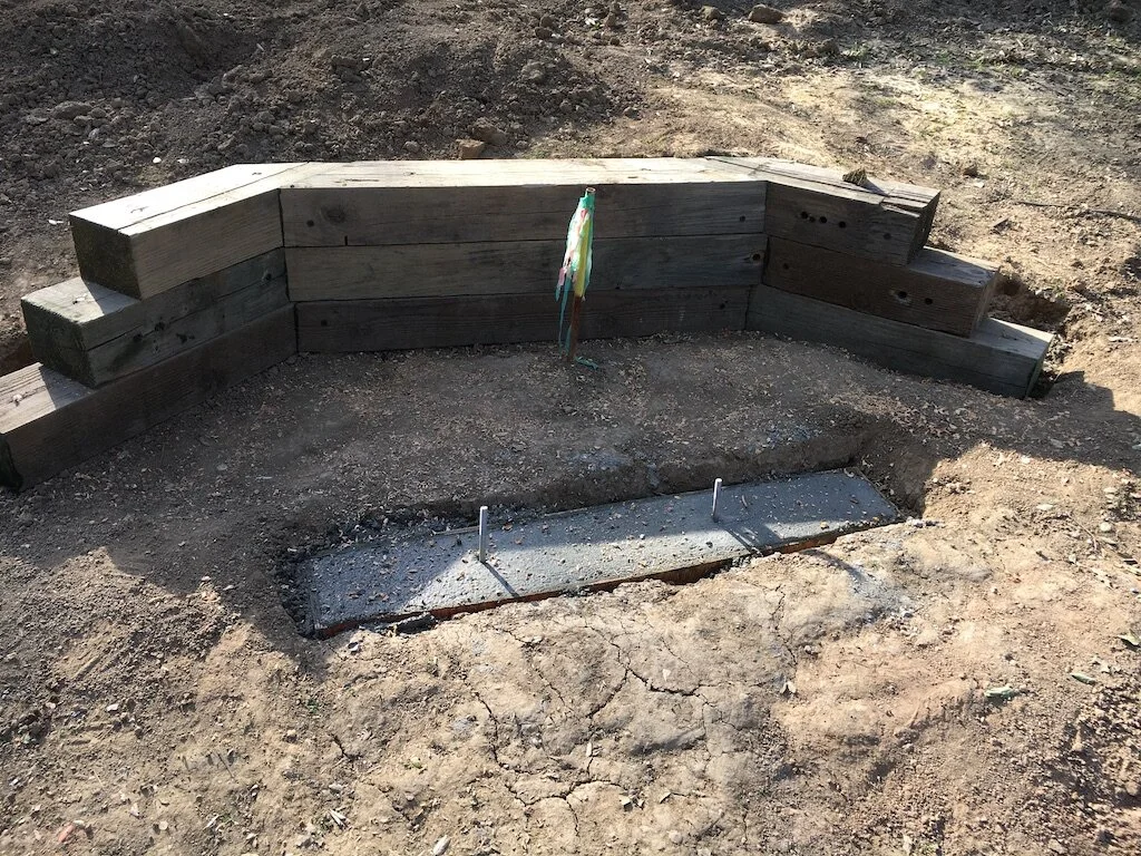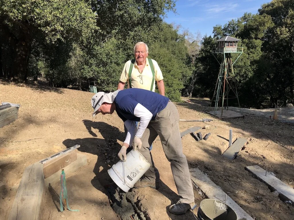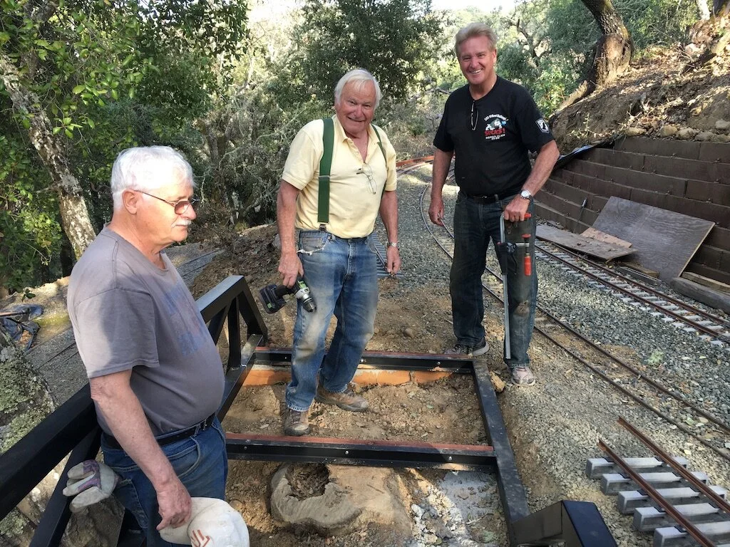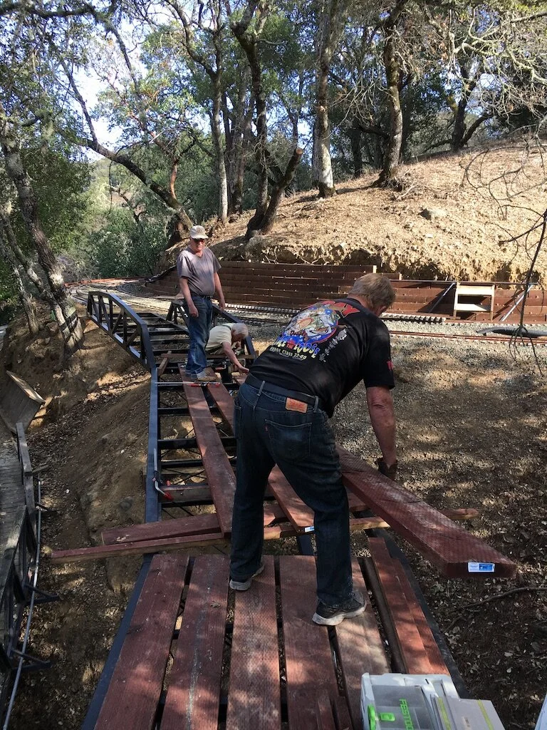 With all steel sections of the Lumber Camp Bridge in place, most everyone focused on the trestle section today. Bruce and Mike lead the cement work whilst Ken built a small berm retaining wall