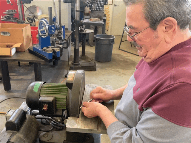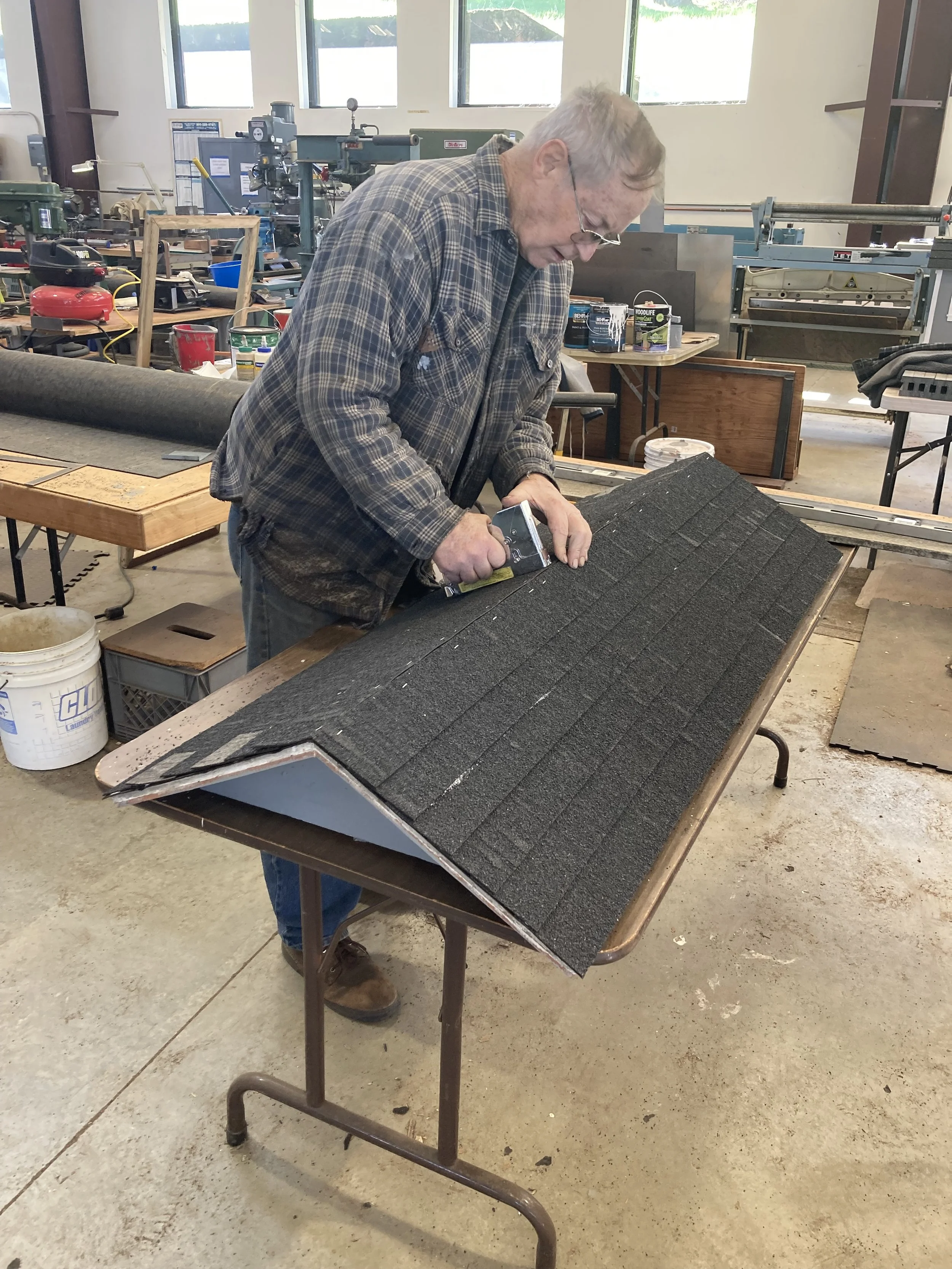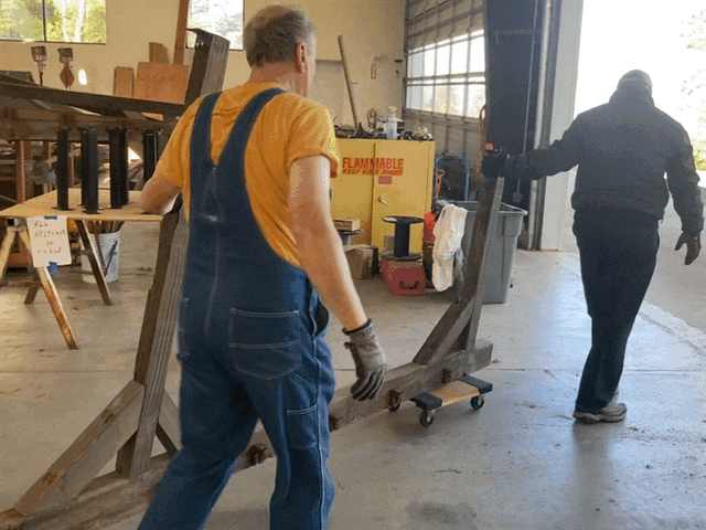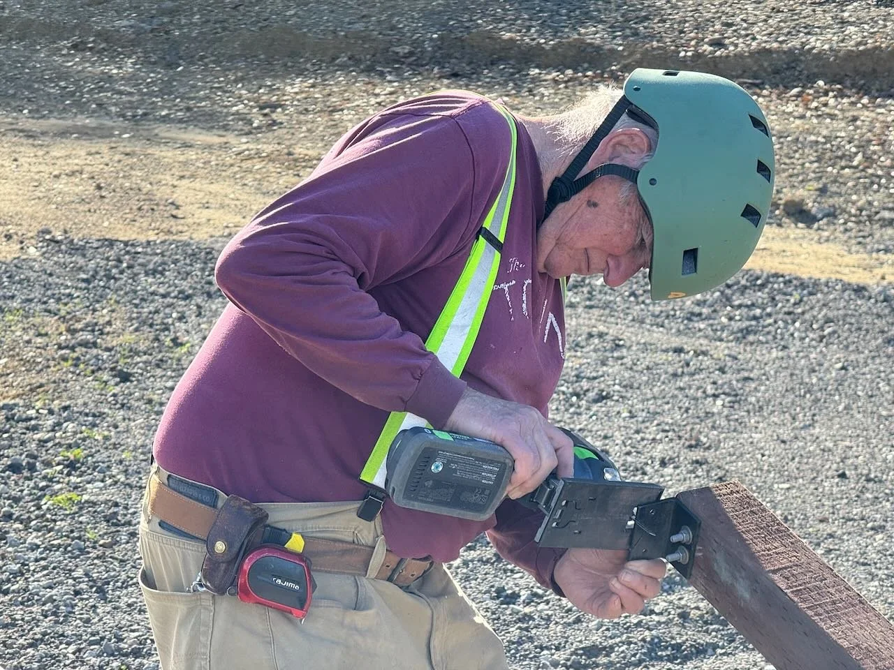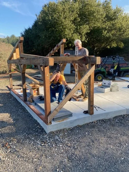 Mike’s Roundhouse Crew, having built the frames that make up the structure of the Roundhouse, began the assembly process by attaching the fames to the mudsill and concrete slab in Rabbit Flat. They had already completed the frames up in building 4, and they came together perfectly out in the field.