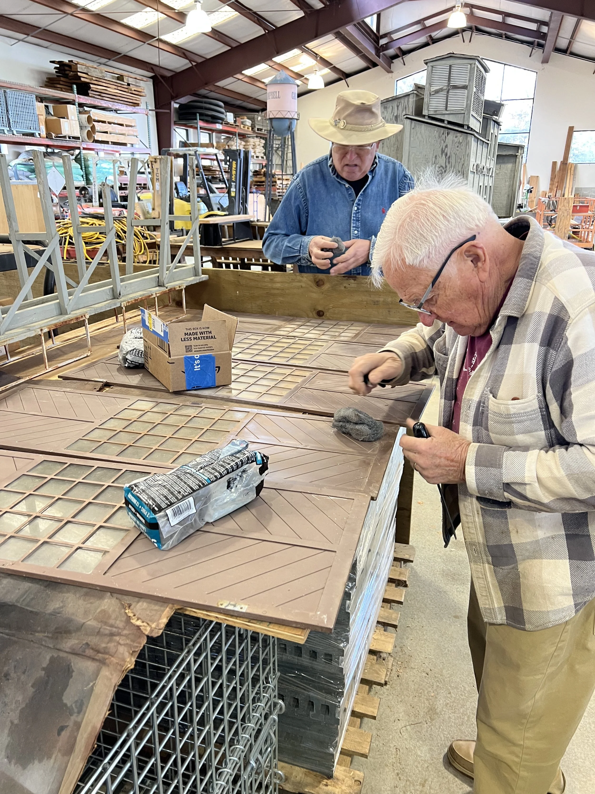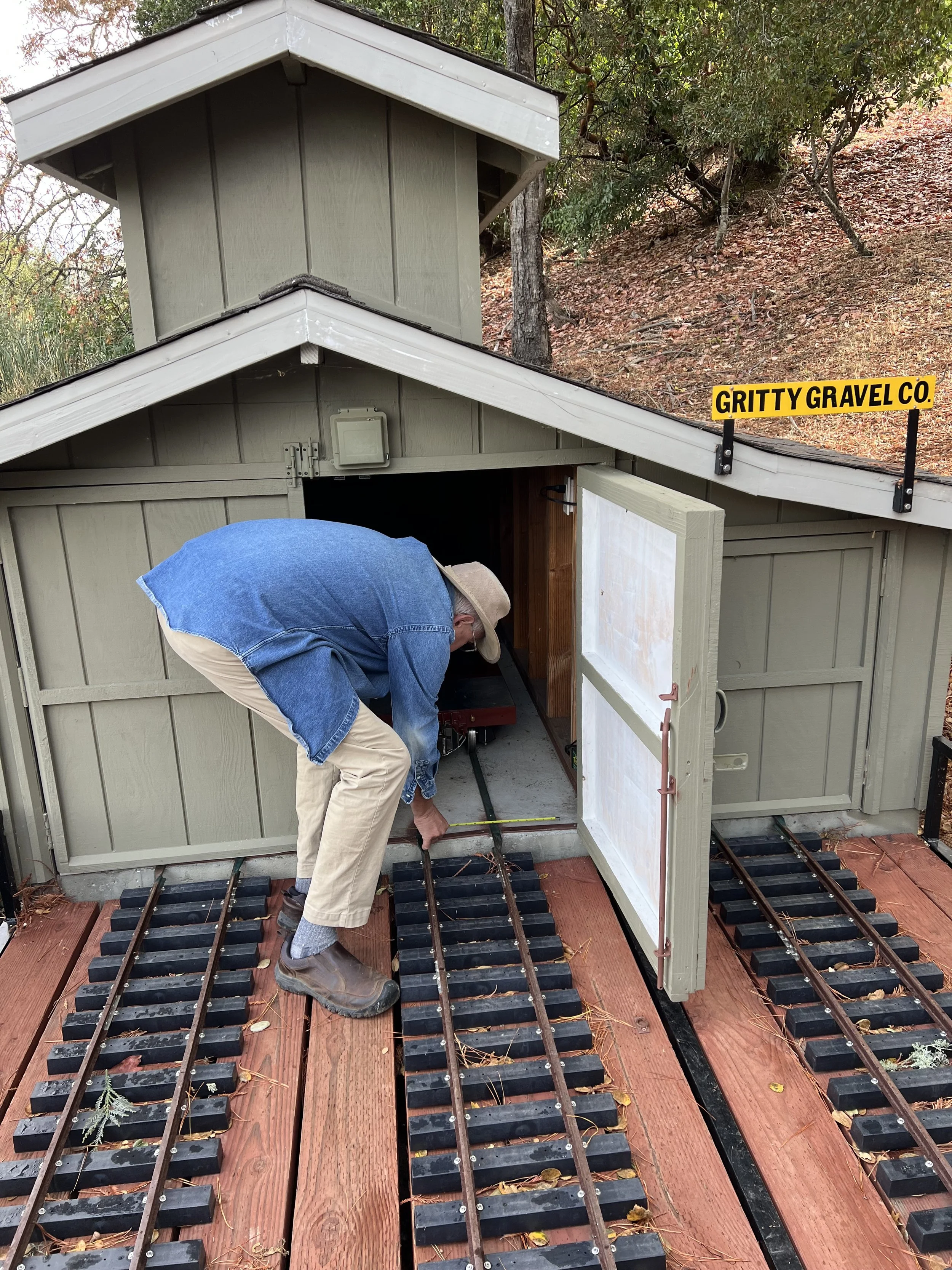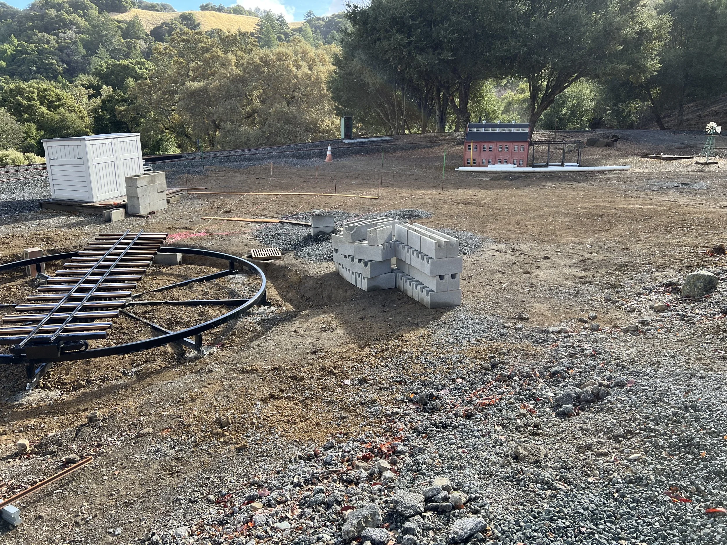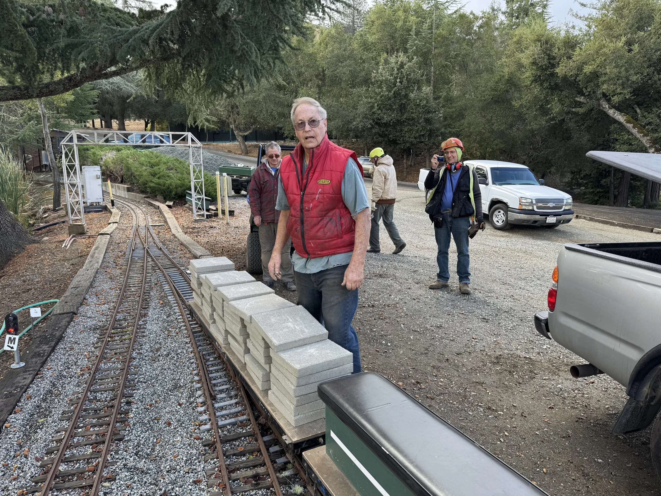Tom (nice view), Matt, & Dee unload blocks for the roundhouse turntable floor