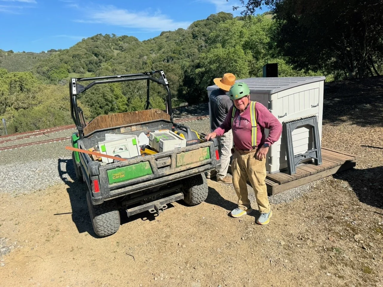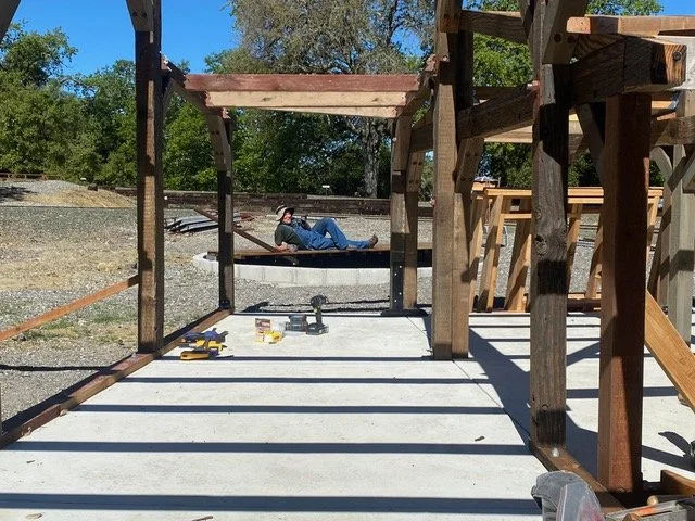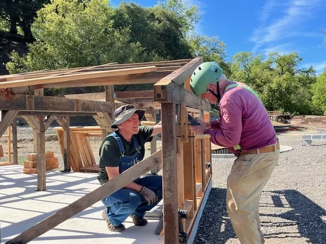 Robert fastening the rafters in, Sam installing a window header while Will fires up the generator.