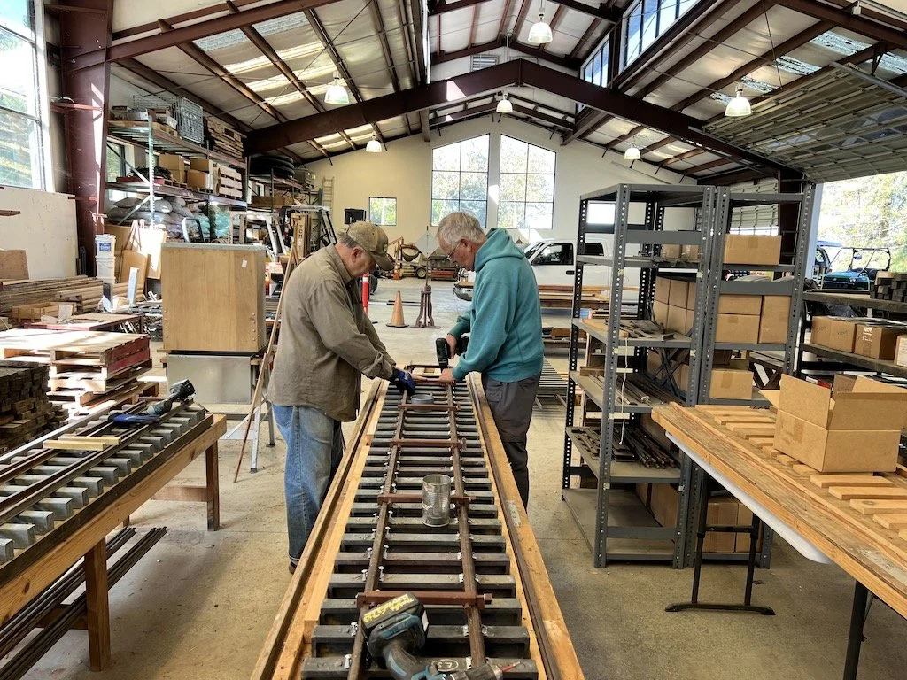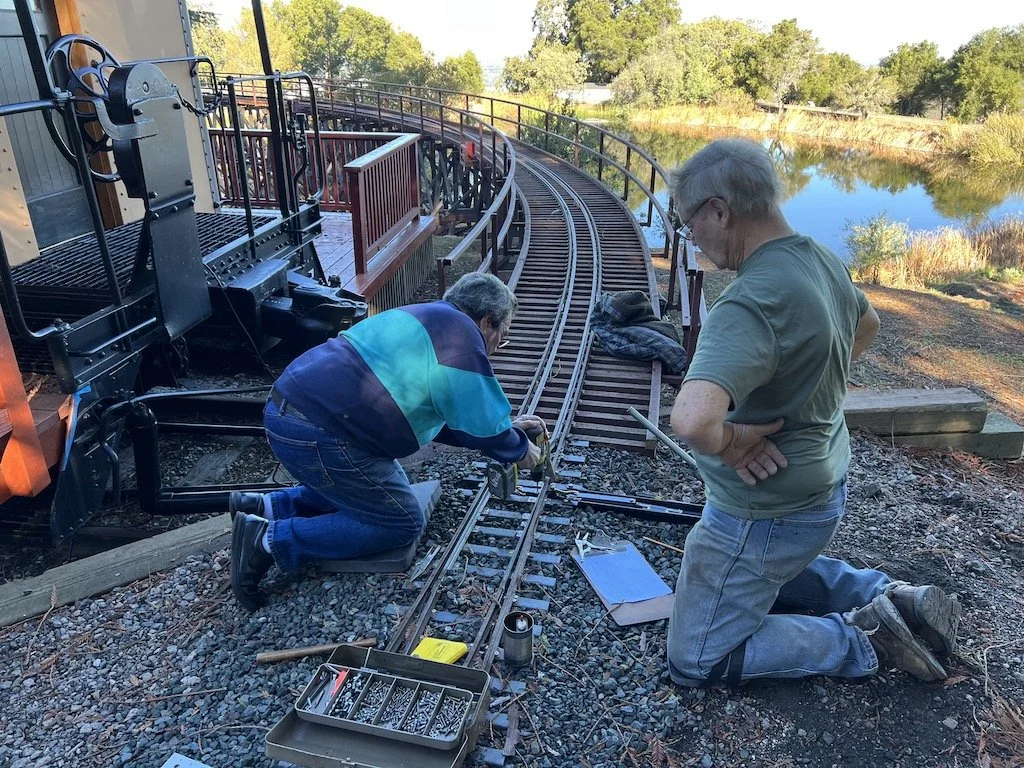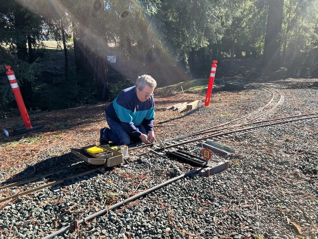 Tom and Carl installed two switch stands by the big caboose. We almost ready to go in circles around the trestle.