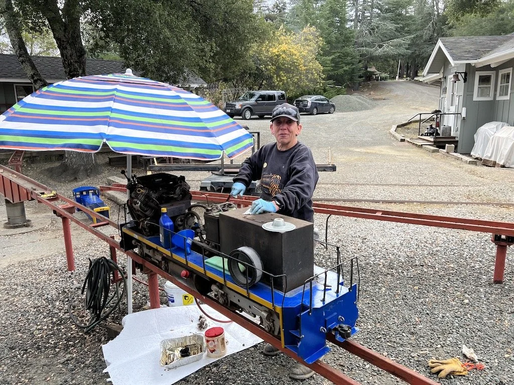 Dee changes the oil during a slight rain shower